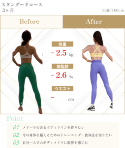 筋肉量、食事量の増加により代謝が上がり体重・体脂肪・ウエストを大きく減らせた