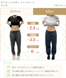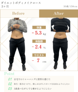 筋肉量の増加、定期的な有酸素により体重・体脂肪・ウエストの減少